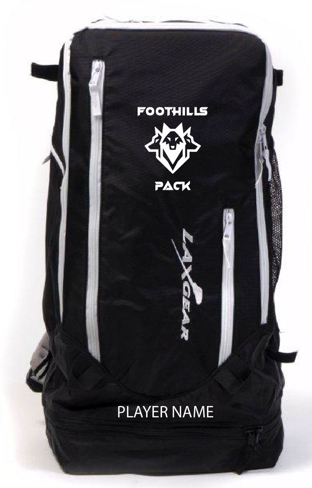 Foothills black mini or Laxpack for goalies with lifetime warranty and logo and player name included. Embroidery takes a little over a week before shipping.
